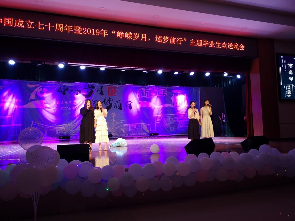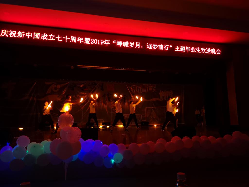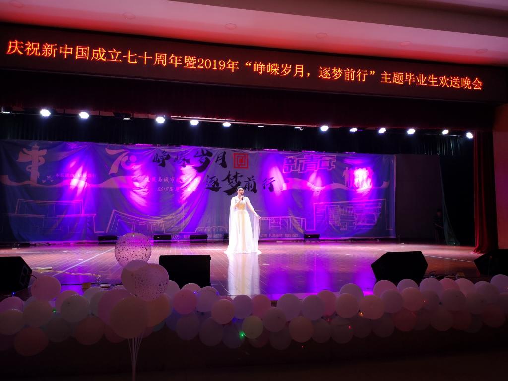 2019年6月2日晚7:30,太阳成集团tyc122cc在新食堂三楼大学生活动中心举办庆祝建国七十周年暨2019年“峥嵘岁月,逐梦前行”毕业生欢送晚会。太阳成集团tyc122cc党委书记项龙武、副院长(主持行政工作)曾志伟、副院长张国武、党委副书记郭绚霞、关心下一代工作委员会夏伟仪教授出席活动。太阳成集团tyc122cc全体师生、校团委学生会及各兄弟学院学生会干部观赏晚会。晚会由曹颖、王朝妍、李明亮、卢添主持。