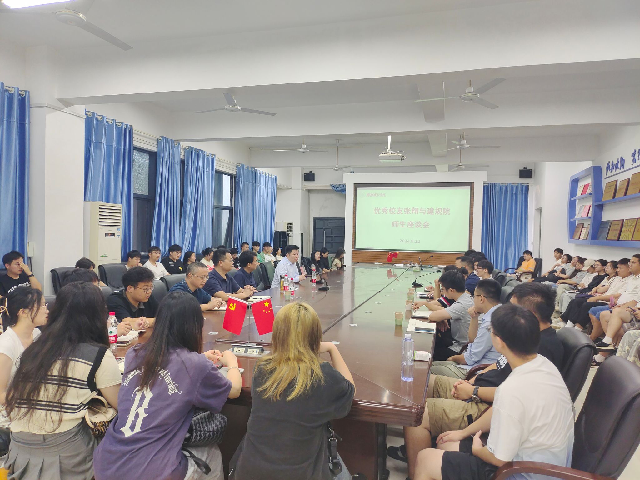 本网讯(通讯员 汤慧)2024年9月12日,我院邀请2007级城乡规划专业杰出校友——太平洋建设大区总裁、粤商建设董事局主席张翔先生,与2023、2024级全体研究生及部分大四本科学生开展了一场富有深意且生动有趣的座谈会,参加会议的有院长宁启蒙,党委书记彭建国、副书记曾强、副院长王晓华以及城乡规划专业教师代表,会议由彭建国主持。
