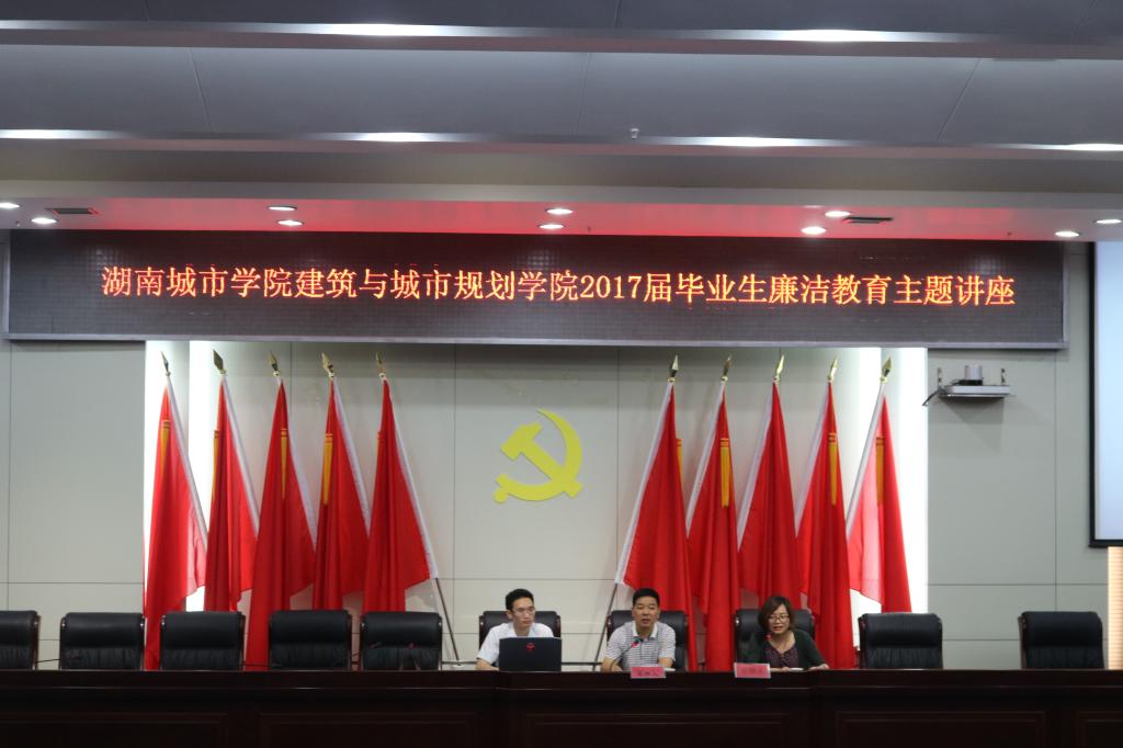 5月12日下午3:00,太阳成集团tyc122cc太阳成集团tyc122cc2017届毕业生廉洁教育主题讲座在我校图书馆报告厅举行。本次讲座以“今天的骄子,如何打好明日主场”为主题,邀请了赫山区人民检察院副检察长汤奠南先生担任主讲。讲座由建规院党委副书记郭绚霞主持。